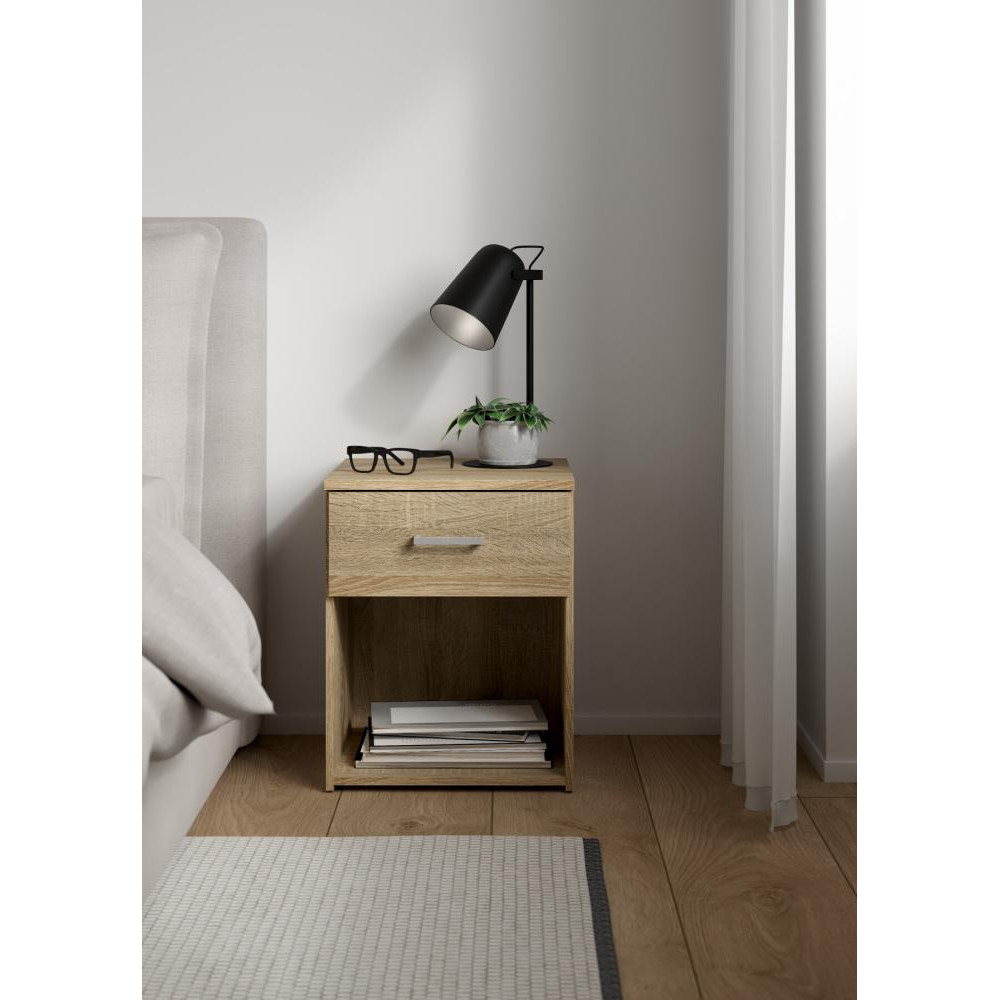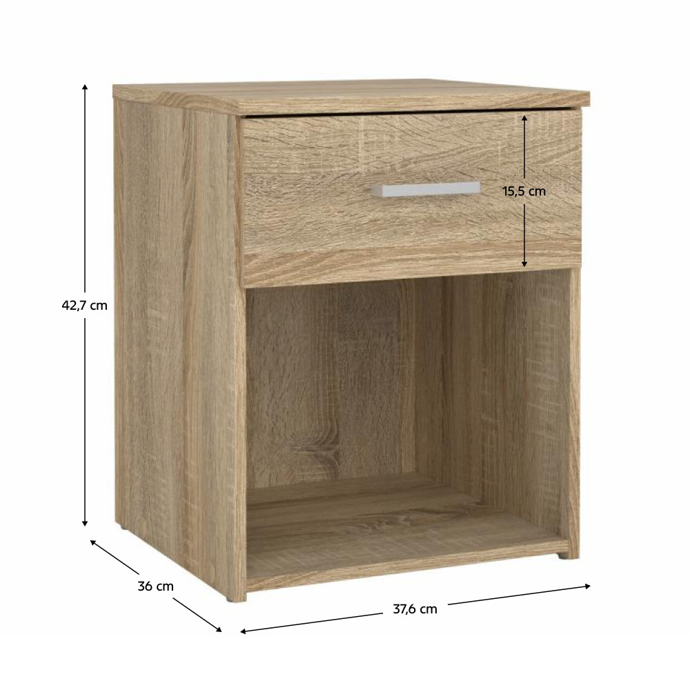 A GARBO éjjeli asztal pontosan ezt a harmóniát támogatja. Bár kompakt méretei révén könnyedén elhelyezhető az ágy jobb vagy bal oldalán, meglepően tágas rakodótérrel rendelkezik. A minőségi laminált faforgácslapból készült, a népszerű sonoma tölgy színben pompázó bútordarab időtálló eleganciát visz a térbe. Ez a sokoldalú tárolóasztal egy tágas fiókot és egy nyitott polcot is kínál, így tökéletes helyet biztosít az olvasott könyvnek, egy pohár víznek vagy a telefonodnak. A fiókban diszkréten tárolhatod a személyesebb tárgyaidat, míg a nyitott részen a legfontosabb dolgok mindig kéznél lehetnek.
