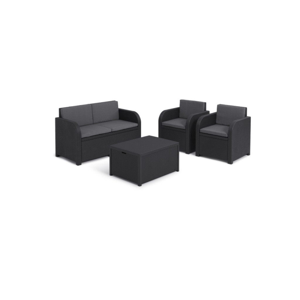 Ellenálló anyagból készült A strapabíró, polipropilén anyag időtálló és szinte minden körülmény között megőrzi eredeti formáját. Mindegyik kültéri bútor UV- és időjárás álló , színük nem fakul ki a napsütésben, valamint rendkívül stabilak és nagy teherbírásúak . Az innovatív fröccsöntési technológiának köszönhetően, nem pattognak el a műrattan szálak . A mintázata rattanhatású, de nem fonott, így jóval tartósabb.