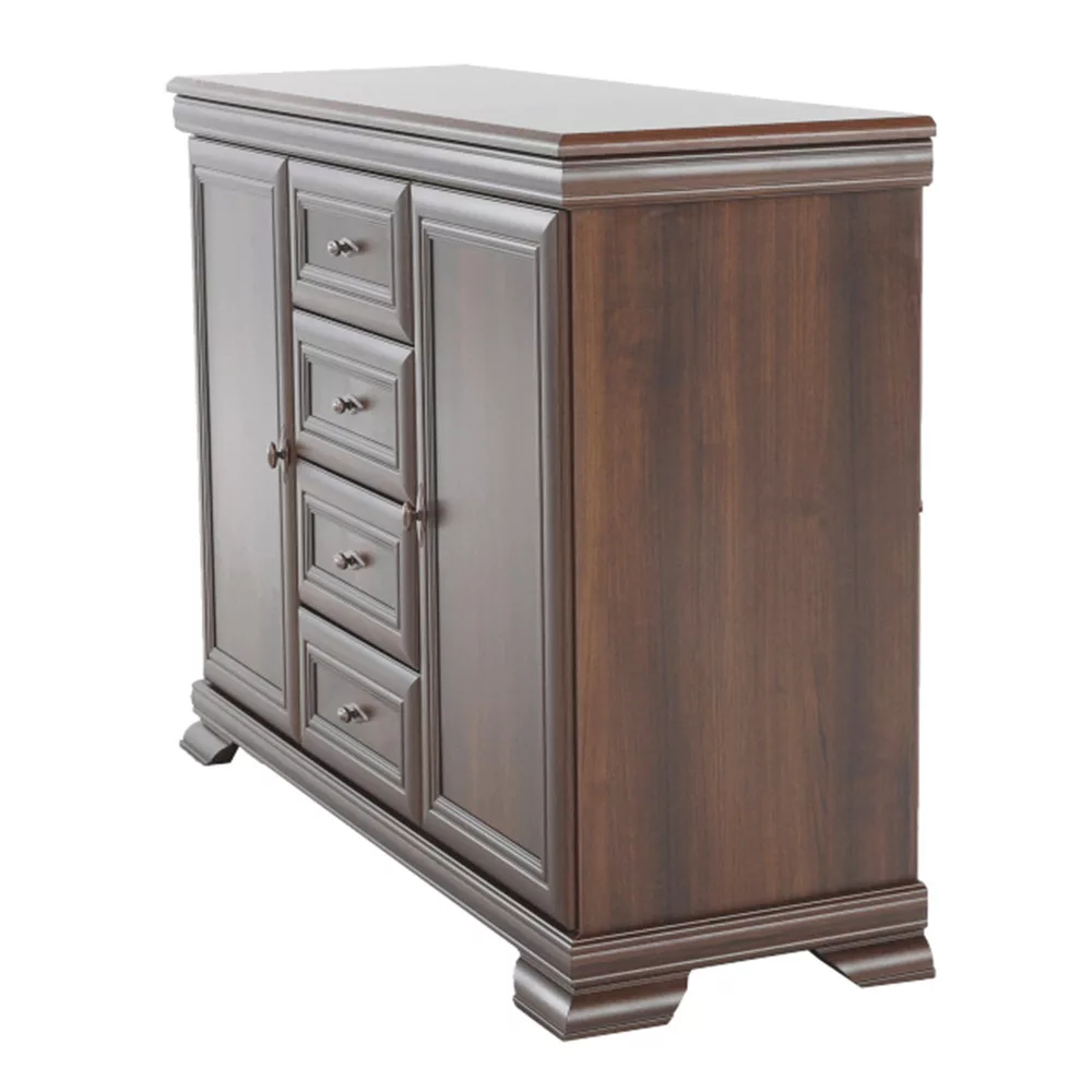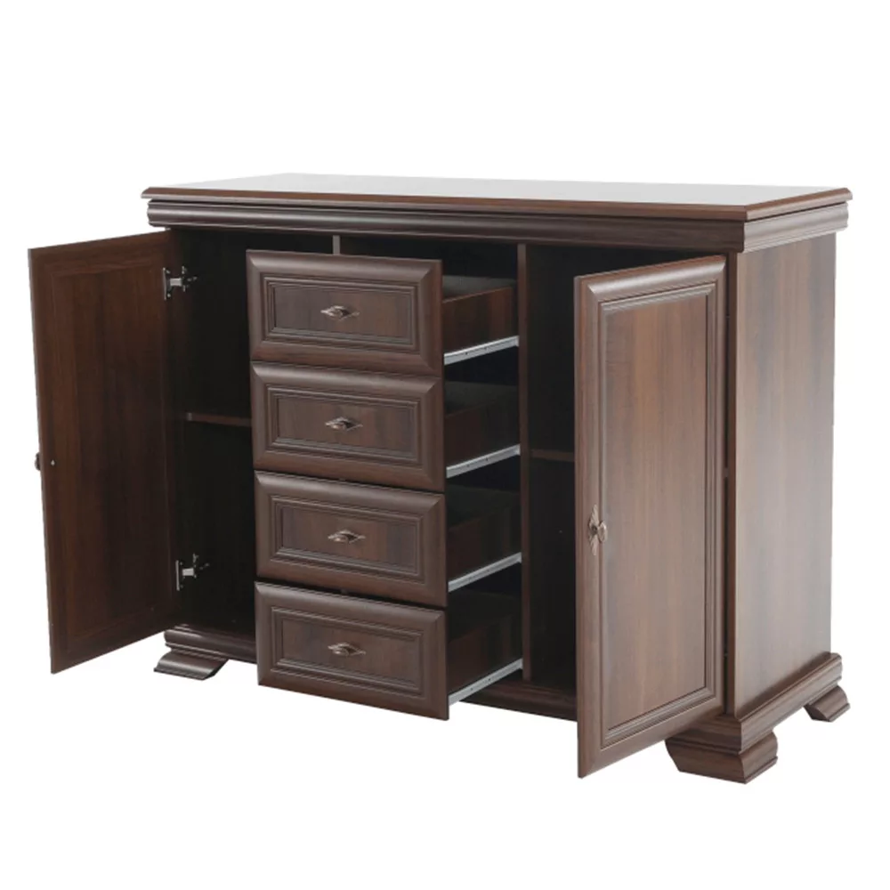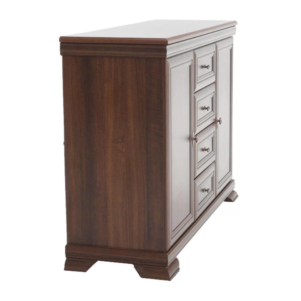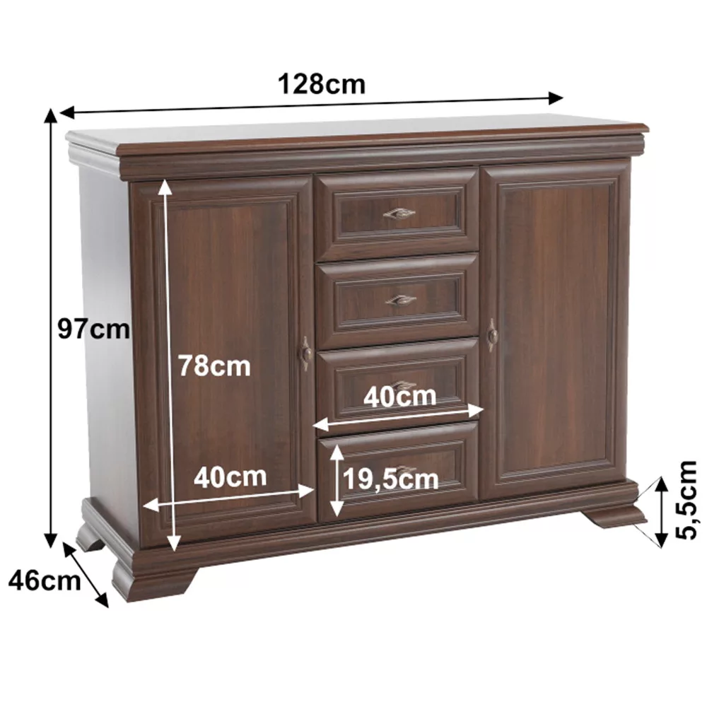 A komód precíz kidolgozását a részletes műszaki paraméterek is alátámasztják. Anyaga tartós, laminált DTD, melyet elegáns MDF lécek és masszív fém fogantyúk egészítenek ki. A bútor teljes mérete (SzéxMéxMa): 128x46x97 cm. A vázszerkezet 15 mm, míg a felső és alsó lapok extra vastagsága 22 mm, biztosítva a stabilitást. A négy fiók mérete egyenként (SzéxMa): 40x19,5 cm, a két ajtóé pedig (SzéxMa): 40x78 cm. Az ajtók mögötti polcok 1,5 cm vastagok. A bútor lábakon áll, az alsó tér magassága a padlótól 10,5 cm, ami megkönnyíti a takarítást. A bútort lapraszerelt állapotban szállítjuk, az összeszerelési útmutató segítségével könnyedén összeállítható.