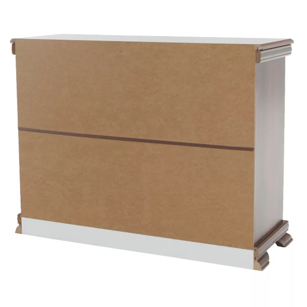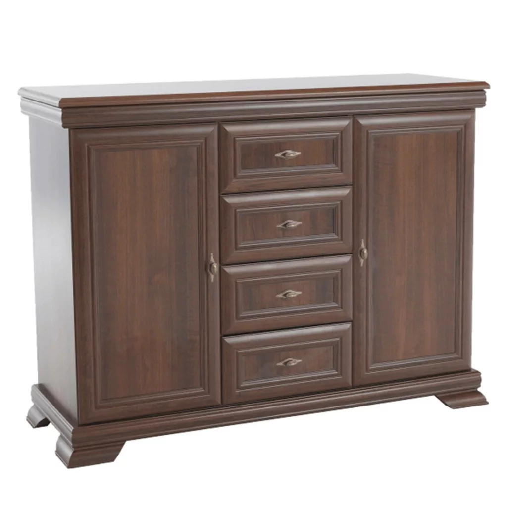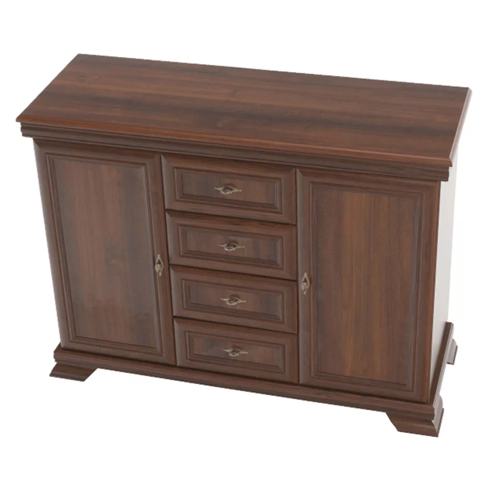 A komód precíz kidolgozását a részletes műszaki paraméterek is alátámasztják. Anyaga tartós, laminált DTD, melyet elegáns MDF lécek és masszív fém fogantyúk egészítenek ki. A bútor teljes mérete (SzéxMéxMa): 128x46x97 cm. A vázszerkezet 15 mm, míg a felső és alsó lapok extra vastagsága 22 mm, biztosítva a stabilitást. A négy fiók mérete egyenként (SzéxMa): 40x19,5 cm, a két ajtóé pedig (SzéxMa): 40x78 cm. Az ajtók mögötti polcok 1,5 cm vastagok. A bútor lábakon áll, az alsó tér magassága a padlótól 10,5 cm, ami megkönnyíti a takarítást. A bútort lapraszerelt állapotban szállítjuk, az összeszerelési útmutató segítségével könnyedén összeállítható.