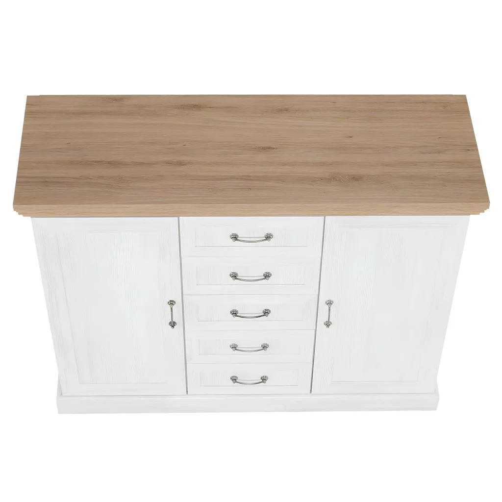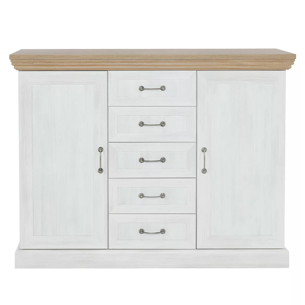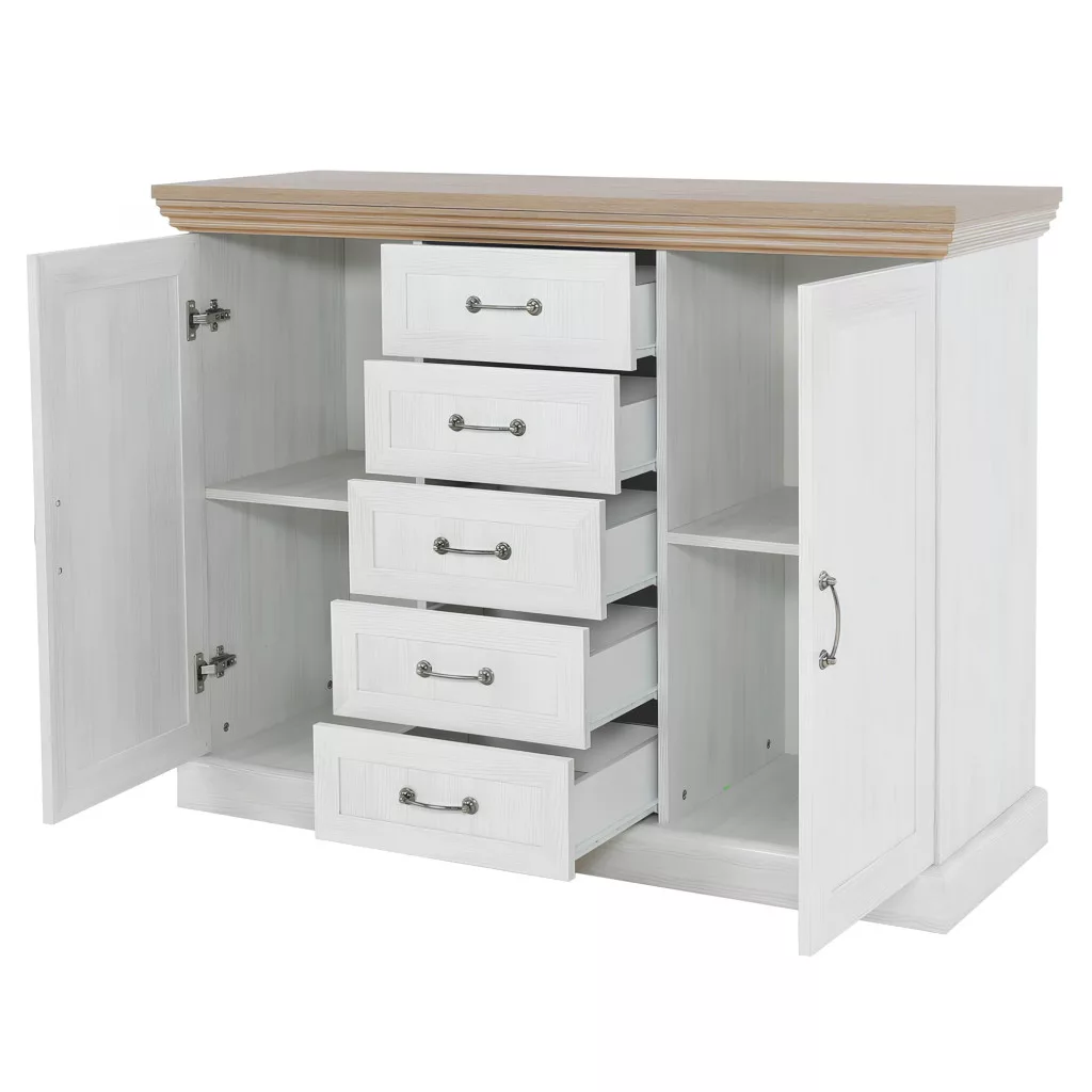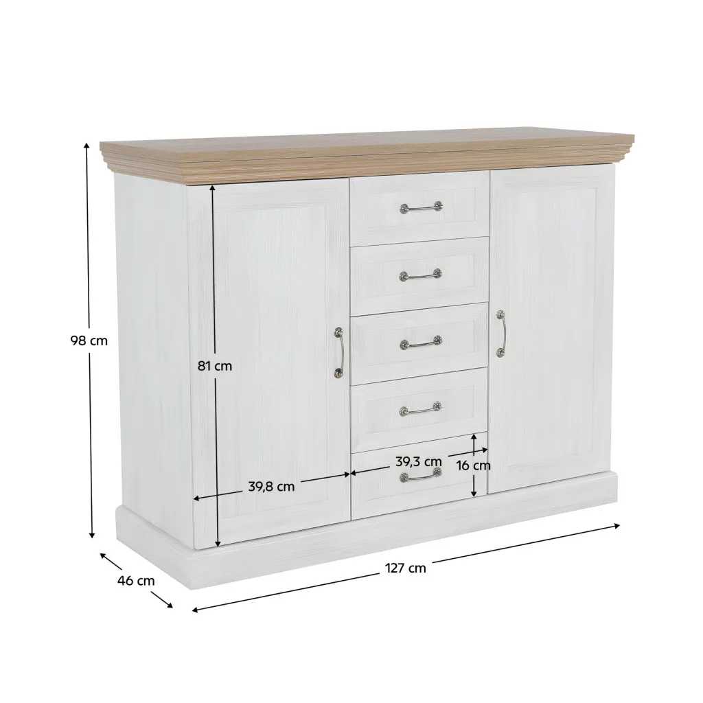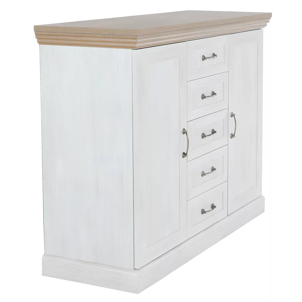 A ROYAL bútorcsalád neve nem véletlen; királyi eleganciát csempész a mindennapokba. A gondosan megtervezett díszlécek finom részletességgel gazdagítják a bútort, míg a masszív, minőségi laminált DTD alapanyag a hosszú élettartam garanciája. A fém fogantyúk egyszerre klasszikusak és időtállóak, tökéletesen kiegészítve a bútor karakterét. A két ajtó mögötti polcos rész és az öt tágas fiók bőséges tárolóhelyet biztosít, így ez a komód ideális választás lehet akár ruhás komódnak is, segítve a rendszerezett és átlátható tárolást.