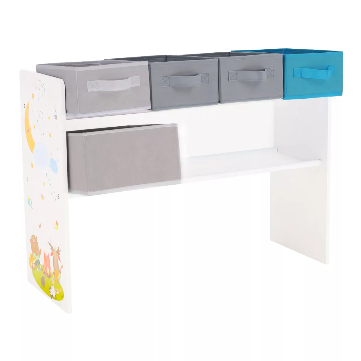 A tervezés során a legfontosabb szempont a gyermekek önállóságának támogatása volt. A tároló magassága és kialakítása lehetővé teszi, hogy gyermeked önállóan, könnyedén elérje és elpakolja kedvenc játékait, könyveit vagy rajzeszközeit. Ez a folyamat játékos formában tanítja meg a felelősségre és a rend szeretetére, miközben a kíváncsiságát és felfedezőkedvét is ébren tartja. A három polcon elhelyezett szövet tárolók és a felső részen található akasztós boxok bőséges helyet kínálnak a kincseknek, így minden játéknak meglesz a maga helye.