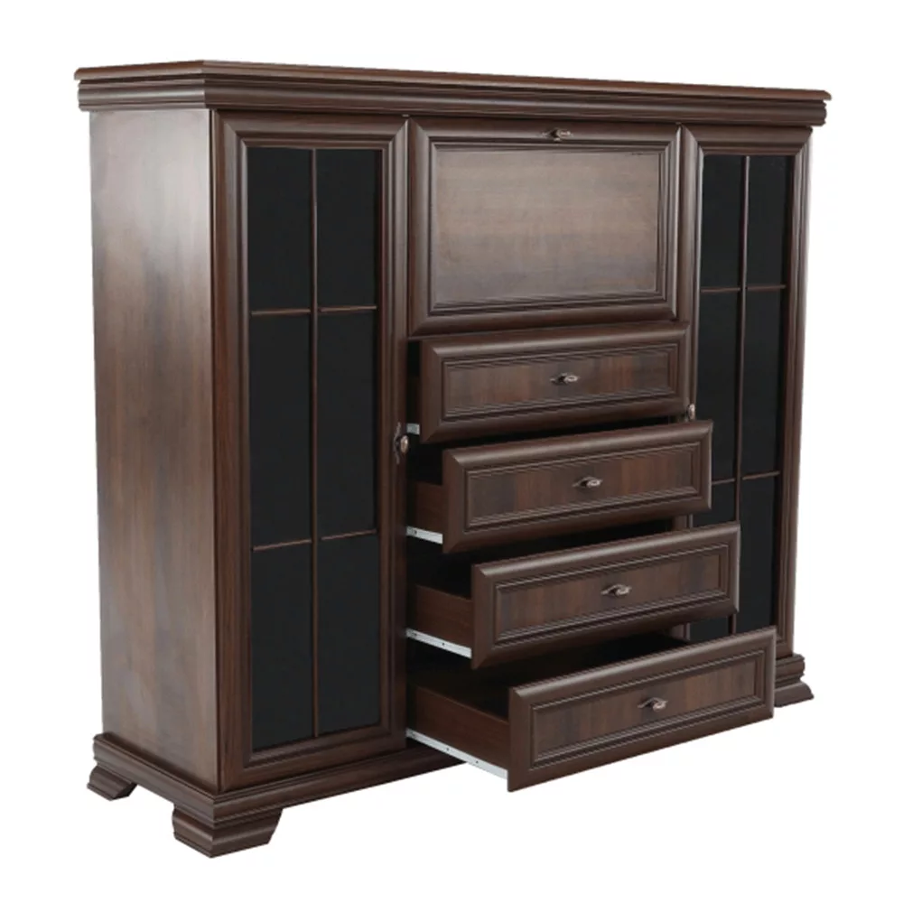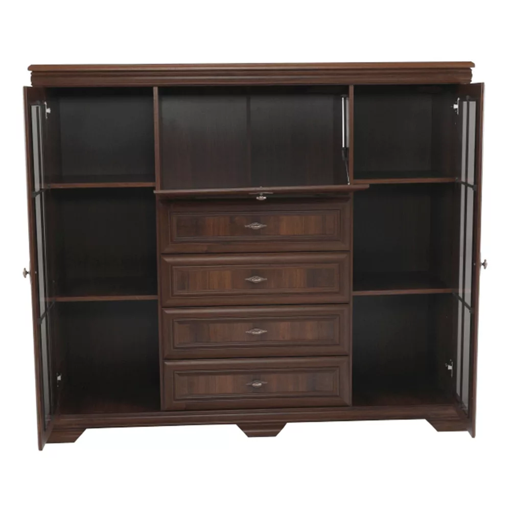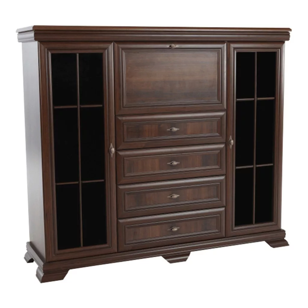 - Kialakítás: Négy tágas fiók, két polcos vitrinszekrény üvegajtóval, egy központi bárszekrény