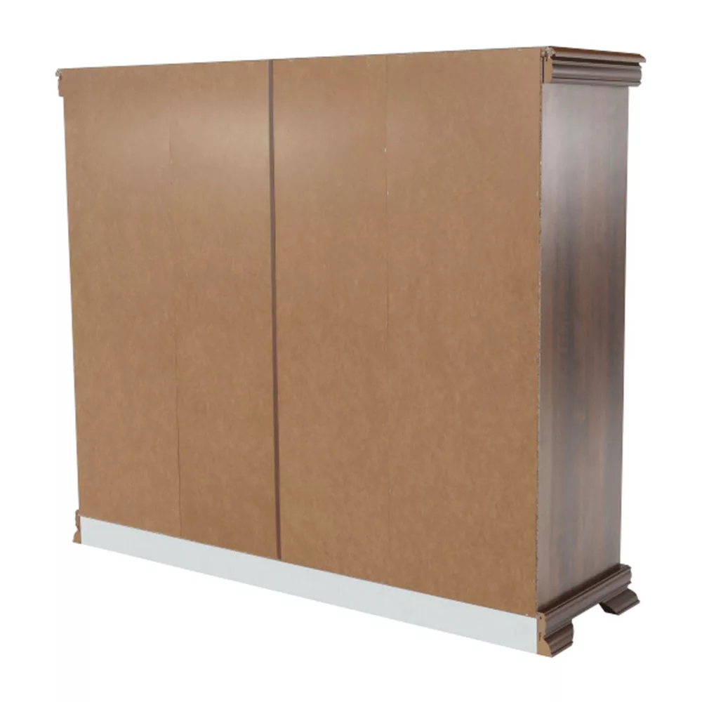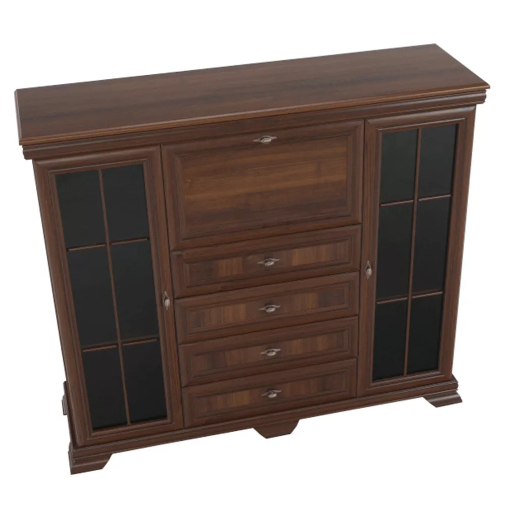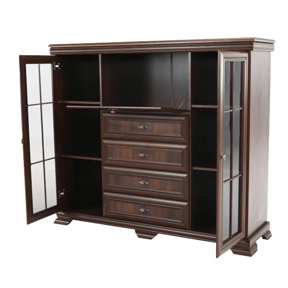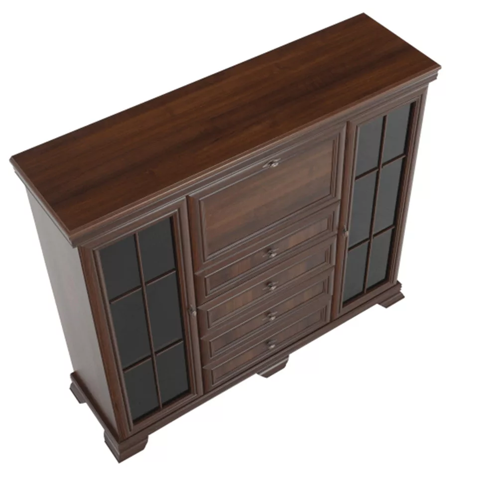 - Kialakítás: Négy tágas fiók, két polcos vitrinszekrény üvegajtóval, egy központi bárszekrény