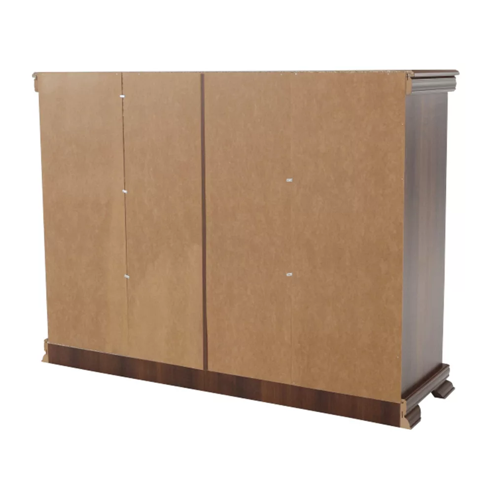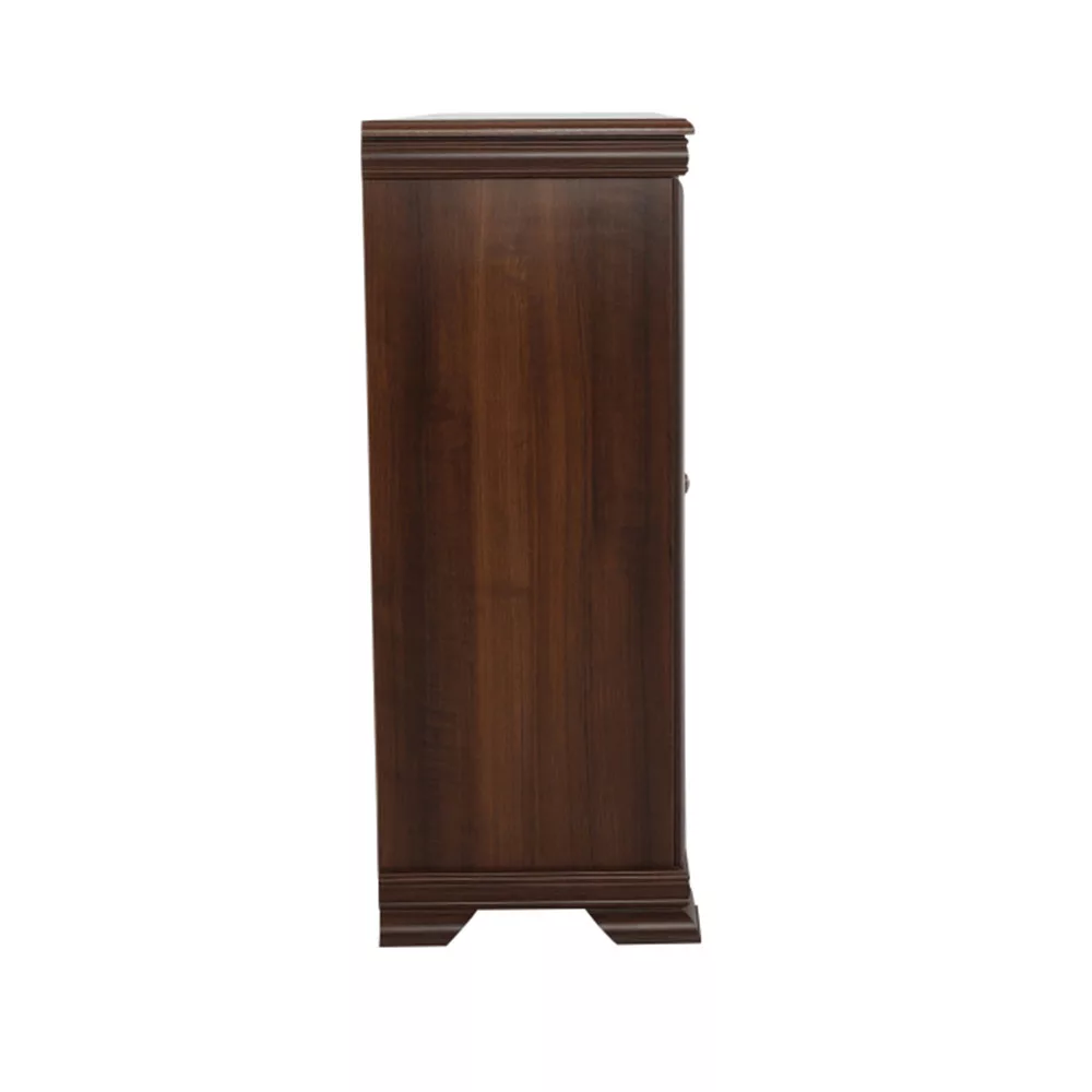 A KORA KK6 komód nem csupán esztétikai értéket képvisel, hanem rendkívül funkcionális is. A bútordarab egy praktikus bárszekrénnyel van kombinálva, amely mellett kétoldalt egy-egy elegáns üveges szekrény kapott helyet. Ez a kialakítás kiválóan alkalmassá teszi arra, hogy egyszerre funkcionáljon mint pohárszék vagy porcelán szekrény, ahol a legszebb készleteidet méltó módon mutathatod be. A vitrines részeket két-két polc osztja három tárolórekeszre, így ez a bútordarab ideális kiállító szekrény is egyben. A középen elhelyezett három mély fiók bőséges helyet kínál az evőeszközöknek, textíliáknak vagy egyéb, szem elől elrejteni kívánt tárgyaknak. A minőségről a strapabíró, laminált DTD váz, az MDF díszlécek, a finom kidolgozású fém fogantyúk és a gondos tervezés tanúskodnak.