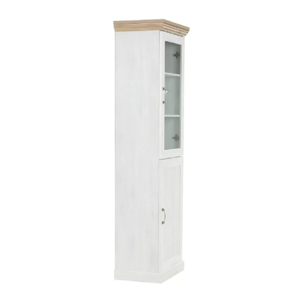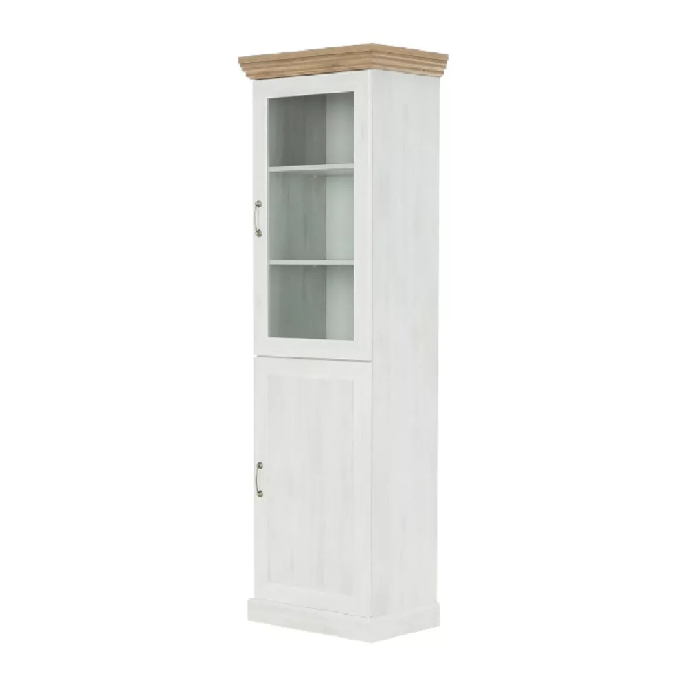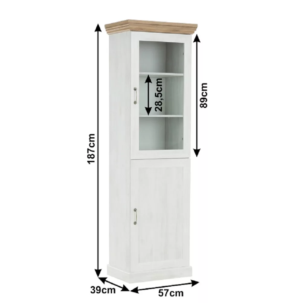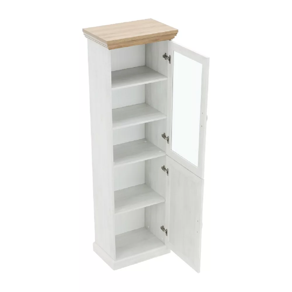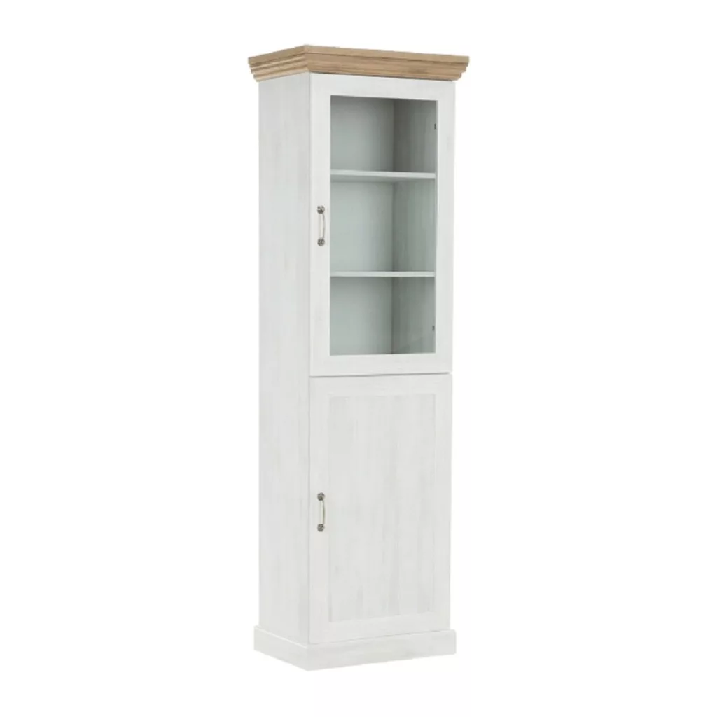 A ROYAL üveges szekrény a provence-i stílus esszenciáját ragadja meg, modern köntösben. Az északi fenyő világos, légies árnyalata és a vad tölgy meleg, természetes tónusának kontrasztja egyensúlyt teremt a térben. Ez a bútordarab nem csupán tárolóeszköz, hanem egy központi díszítőelem, amely eleganciát és időtlen bájt sugároz. Ideális választás, mint pohárszék a legszebb üvegeidnek, vagy mint porcelán szekrény a féltve őrzött családi étkészlet számára. A felső, üvegezett rész két polcán gyönyörűen érvényesülnek a kiállított dísztárgyak, míg az alsó, zárt szekrény egy polccal diszkrét tárolóhelyet biztosít.